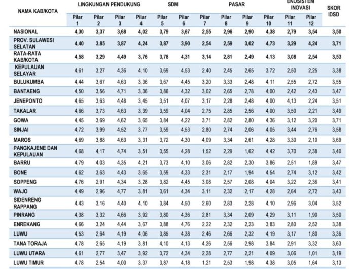 Empat daerah dengan skor setara atau melampaui provinsi pada 2025 yaitu Kota Makassar dengan skor 4,17, Kota Parepare 4,10, Kota Palopo 3,79, serta Kabupaten Gowa yang mencatat skor sama dengan provinsi, yakni 3,71.