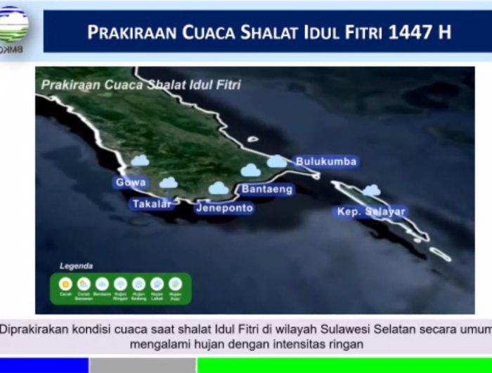 “Hari ini kami Balai Besar BMKG Wilayah IV Makassar memprediksi potensi cuaca yang terjadi pada saat posko Lebaran periode 13 sampai dengan 30 Maret 2026, serta prakiraan cuaca pada saat sholat Idul Fitri baik tanggal 20 maupun 21 Maret 2026,” ujar Nasrol, Jumat, 13 Maret 2026.